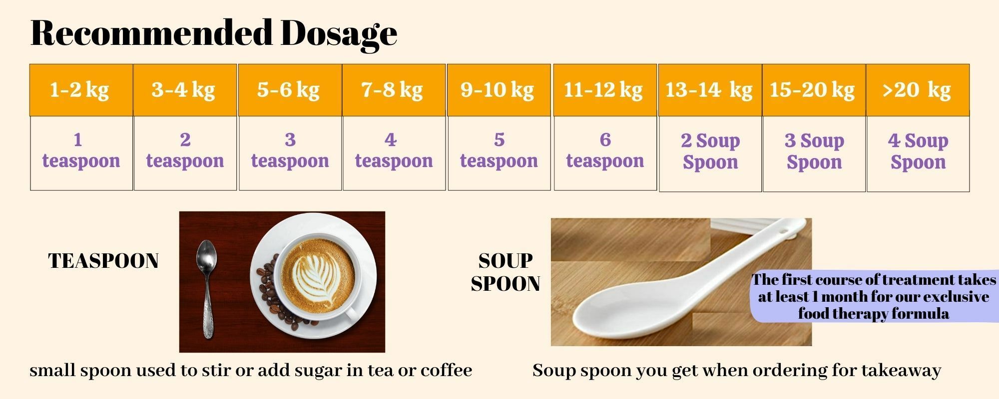 For dogs and cats consuming our food therapy formula for the first time, we recommend starting with 1/3 portion of the recommended dosage based on your dog or cat’s weight for 2-3 days per week. And you can gradually increase to the full recommended dosage after 1-2 weeks.