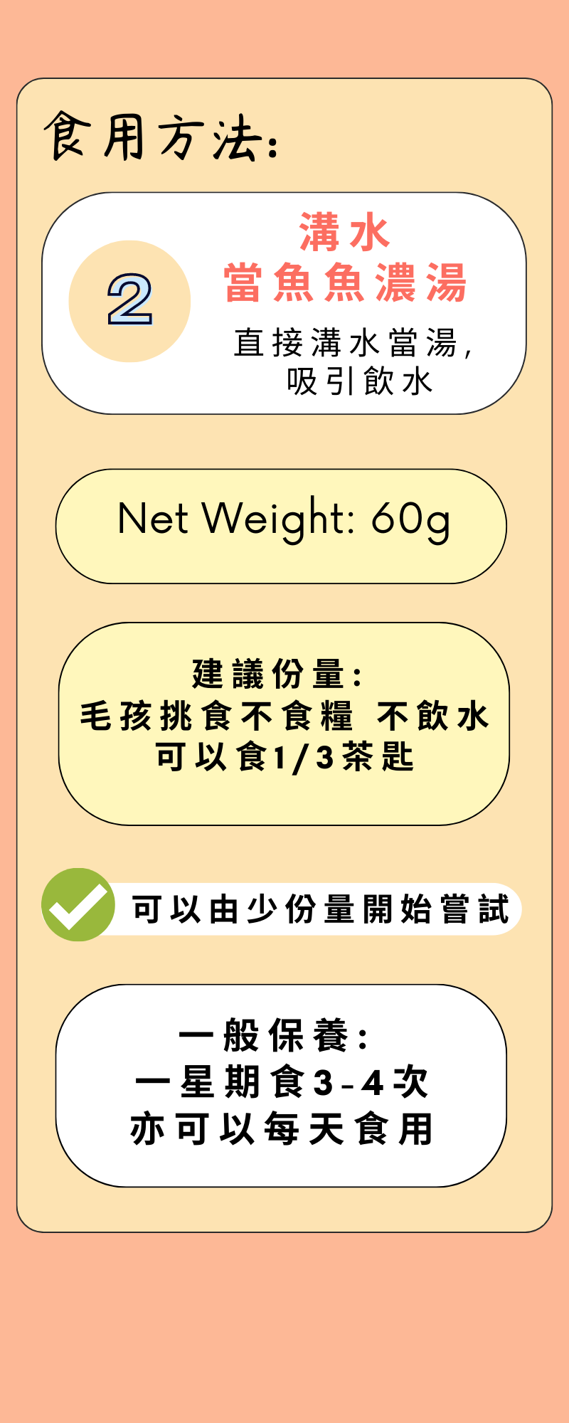 1. 魚魚濃湯:半碗熱水溝3匙,放涼, 當湯俾佢飲 (營養補充,增肥)