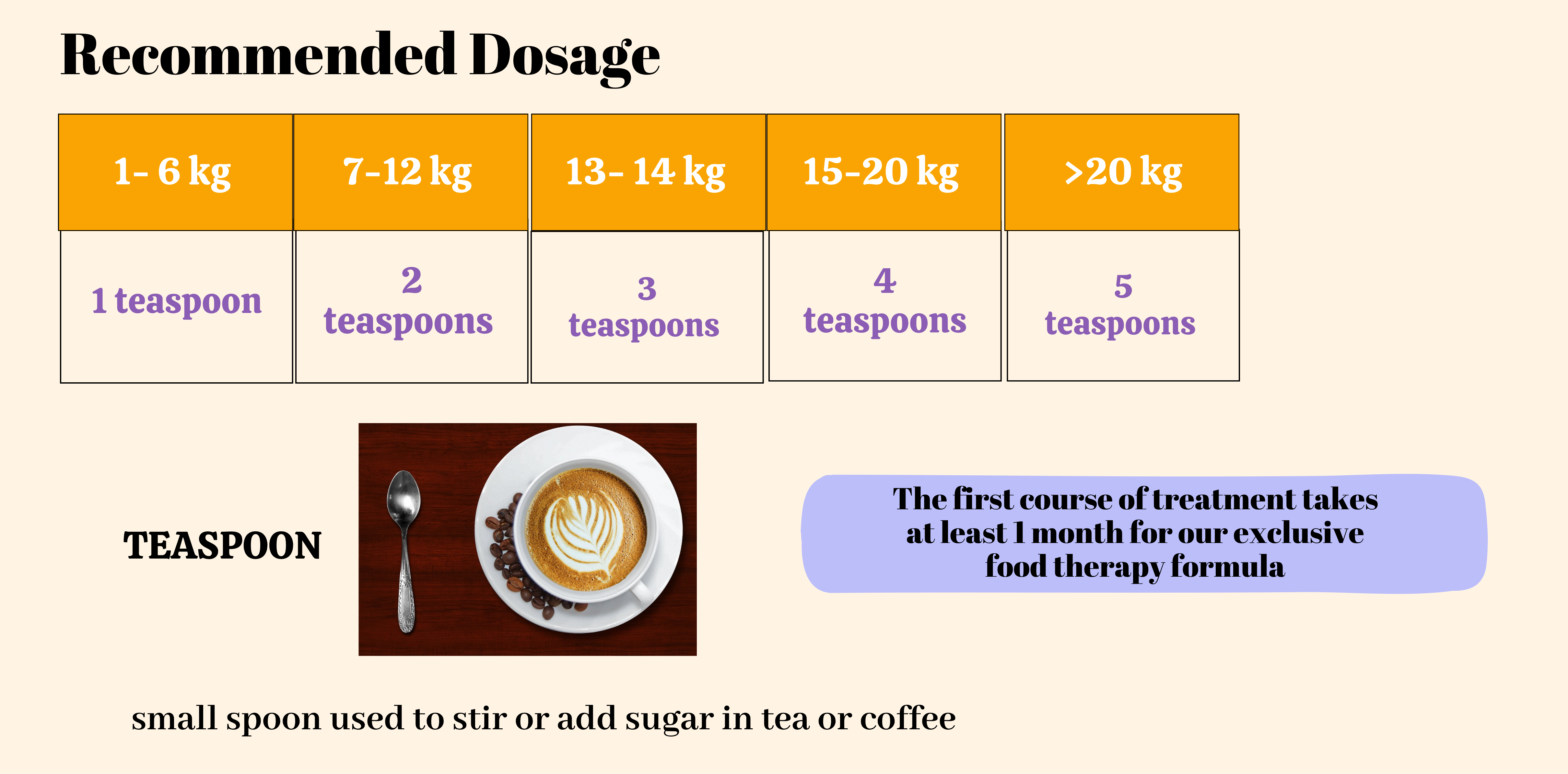 For dogs and cats of 5kg, please eat 1 teaspoon each time