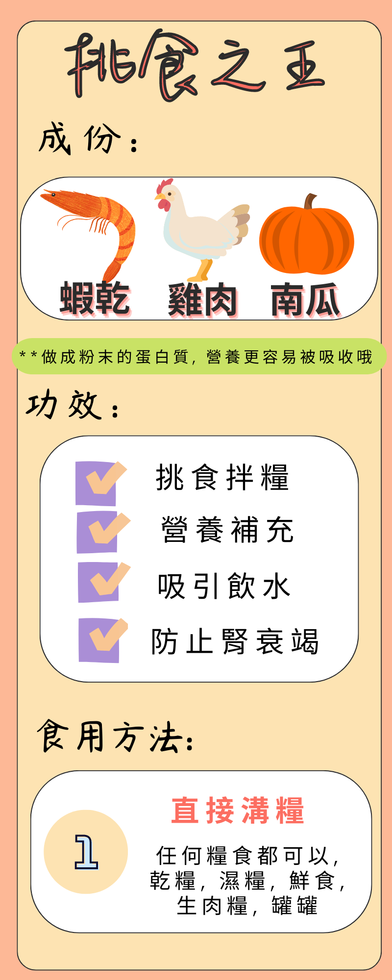 挑食拌糧, 營養補充, 吸引飲水, 防止腎衰竭